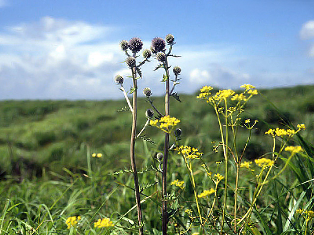 分枝した茎頂部に瑠璃色で筒状の花を5cmほどの球状になって咲かせます。