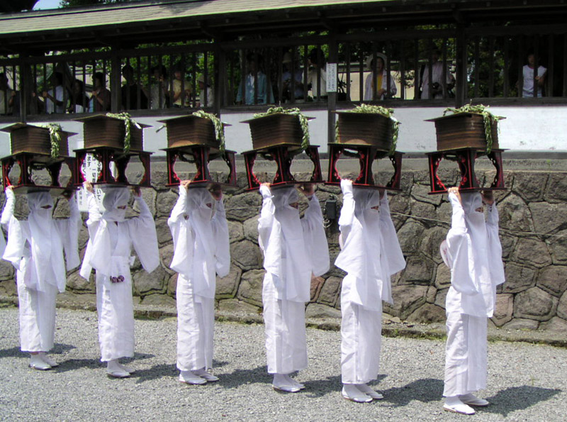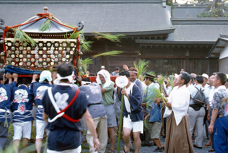 2日早い7月26日に行われる国造神社のおんだ祭りは、神輿が1基、御仮屋は1ヶ所、宇奈利も6名と小規模ですが、祭りの内容は同じで、北外輪山の山裾の杜を背景に、古代の儀式をまの当たりにしているようです。