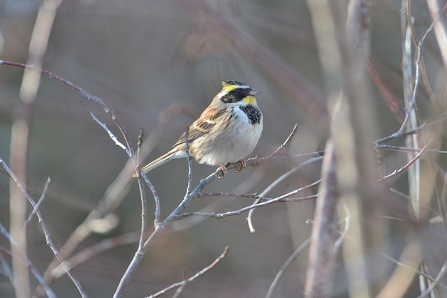 眉斑と喉の黄色い羽毛がよく目立つホオジロの仲間です。