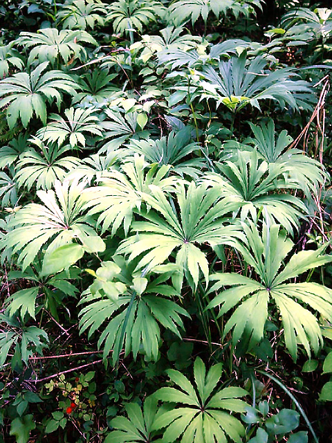 茎葉は2~3個つき、葉柄は楯状について掌状に深裂する。