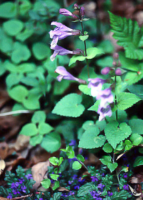 上部の葉の葉腋に2~3個の紫色の唇形花をつけます。