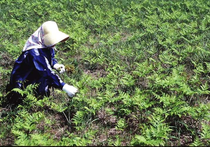 シバ群落は、牧草地特有の植物群落で、東北地方の放牧地などでもおなじ群落がみられます。シバ群落が良い状態に保持されるためには適度の放牧が必要で、阿蘇やくじゅうでは通常10ヘクタール当たり牛15頭だとシバ型草地が保持され、6~10頭ではササ型になり、さらに、5頭以下ではススキ型になります。反対に15頭より多いと過放牧になり、オオバコ型になってしまうといわれています。また放牧の管理が悪く土壌の酸性化が進行すると牛馬が食べないワラビが繁殖するようになります。