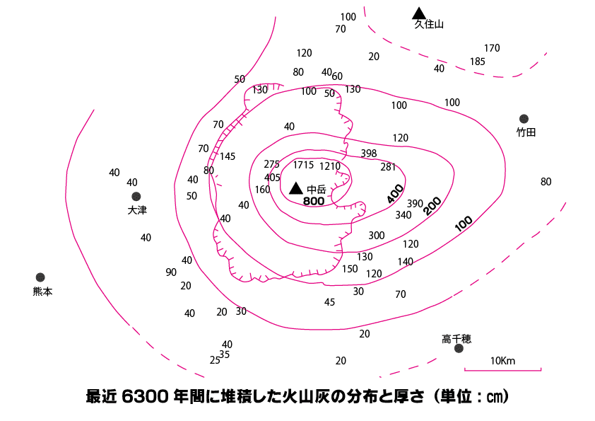 中岳の噴火の特徴は火山灰を大量に噴出する灰噴火です。上空に噴き上げられた火山灰は、遠方で灰黒色の火山灰層をつくります。偏西風帯にある日本では通常、噴煙は東に流され、火山灰の分布も火山の東側に偏ります。しかし、阿蘇中岳の火山灰の分布は円形に近い。これは、中岳の灰噴火の噴煙が低いために地上風の影響を受けたためと考えられます。