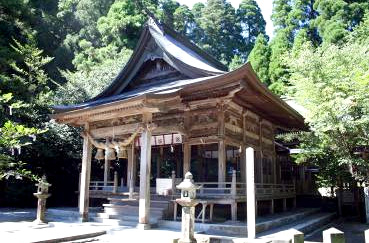 社殿は、本殿が正面4間の側面2間で、拝殿(はいでん)は正面3間の側面3間あり、いずれも入母屋造の銅板葺です。肥後藩主の細川綱利の命により寛文13年(1673)に造営され、それを裏付けるように本殿の棟札(むなふだ)が発見されています。社殿の彫刻などの意匠は、当時の神社建築により造られており、その後に何回かの改修が行われているようです。また、境内末社として、神話にゆかりのある大鯰の霊をまつる鯰宮があります。鯰の研究で知られる秋篠宮殿下が参詣されたこともあります。