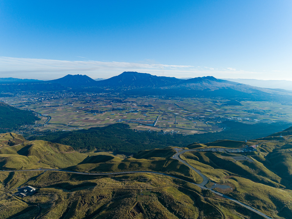 先端に設けられた展望所からは仏様の涅槃像(ねはんぞう)にも例えられる阿蘇の峰々や田園地帯の広がる阿蘇谷をカルデラ東壁(とうへき)から西壁(せいへき)までの大パノラマを一望できます。