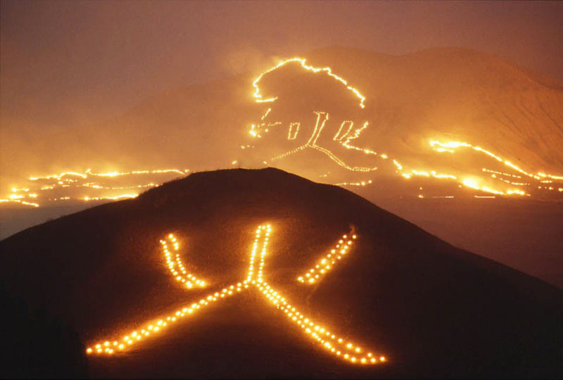 毎年3月に行われる「阿蘇の火まつり」の呼び物「大火文字焼」では、往生岳と本塚に巨大な「火」の文字が重なり「炎」の字が阿蘇の夜空に浮びあがります。