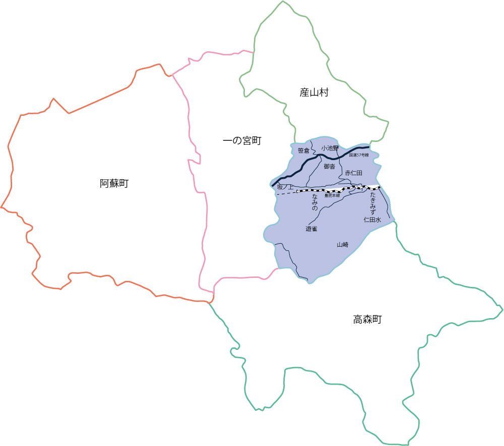 標高700~800㍍の高冷地帯で、西は外輪山につながる一の宮町、南は高森町、東は大分県竹田市と荻町、北は産山村と境を接しています。