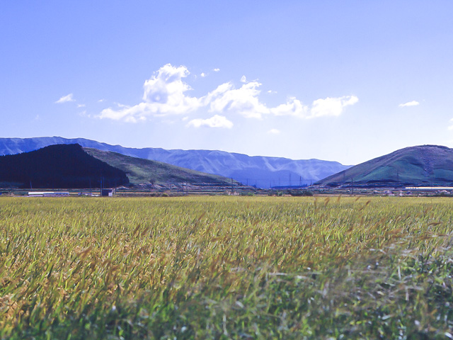 JR豊肥本線の北東、阿蘇谷の平坦面(へいたんめん)から突出(とっしゅつ)する3つの小丘は、独立した1火山の名残です。