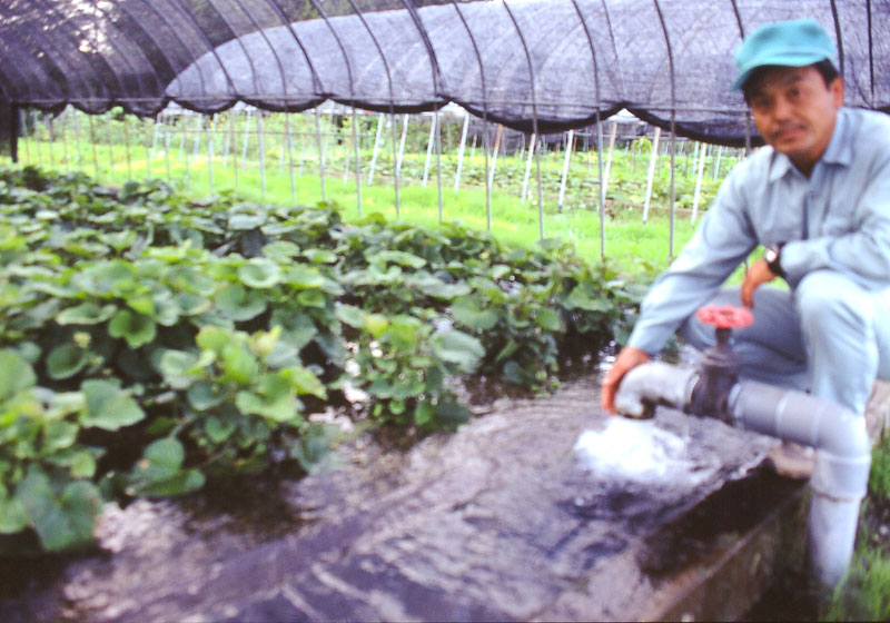 阿蘇農業高等学校(現在の阿蘇中央高等学校清峰校舎)では、昭和63年に校内でボーリングを実施し、地下120㍍で豊富な水を得ました。そしてこの水の産業的な利用を考え、まずワサビ栽培の技術研修のため職員を先進地の静岡県や南小国町の農家に派遣しました。土木科の生徒が外輪山上の小柏川から石や砂利を運び、校内に平地式ワサビ沢を造成して苗を植えました。4~5年間は好成績を得ましたが、次第に病害虫が発生するようになりました。対策として苗移植による病害虫の伝染を防ぐため、種子繁殖の研究も行ないました。戦後独自に小面積のワサビ栽培を手がけた人として、手野の湧水を利用した武田末光氏や和田鉄則氏がいらっしゃいます。