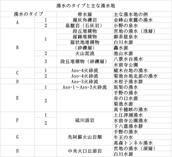 阿蘇火砕流堆積物、特に上位のAso-4中に存在する地下水に関する湧水です。Aso-4は、地層の重なる順序からいうと丈夫に位置するためその層の厚さが薄く、地下水貯留量も少ないため湧水量はあまり多くはありません。