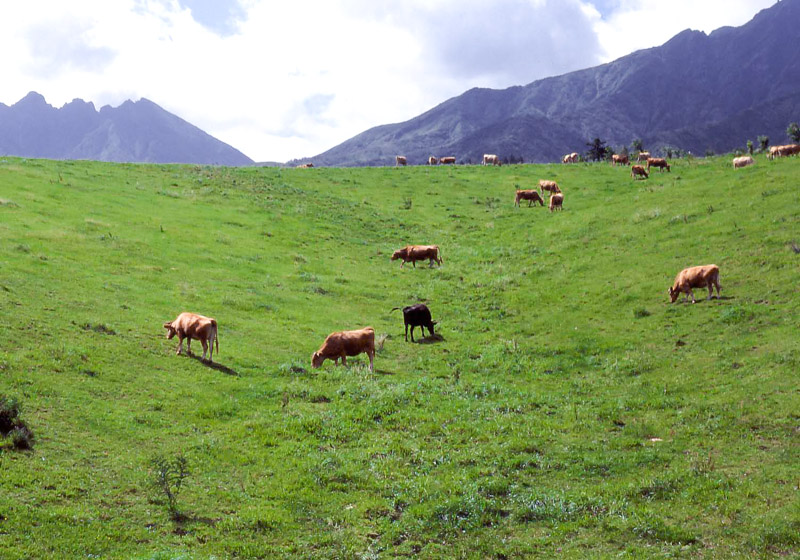 緑の絨毯のような牧草地に放たれた牛は、飛び跳ねたり頭を土に擦りつけたりして、開放感を全身で表現する。これらの牛は、伸びてくる草を次々に食べながら霜が強くなって牧草が枯れる11月下旬までの約240日間、同じ集落出身の仲間と一緒に牧草地での生活を送る。旧来の自然草地における放牧期間は5月から10月までの150日でしたが、牧草は低温伸長性が強いため野草が冬枯れの状態でも青々と育つからです。