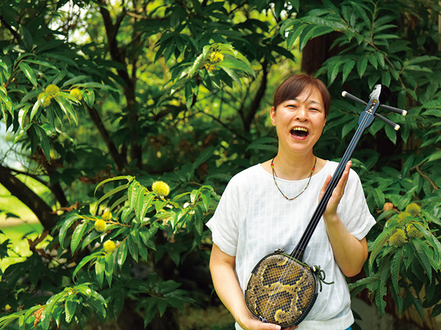大阪から阿蘇に嫁いできた。バスボール審判員として全国を飛び歩く夫が、あるとき沖縄土産に三線(さんしん)を買ってきてくれた。三味線には少し親しんでいたが、初めて接する沖縄の楽器の魅力ははるかに強烈に発信してくる。「向こうで誰かに習ったら?」という夫の勧めに従った。三十八歳のときだ。