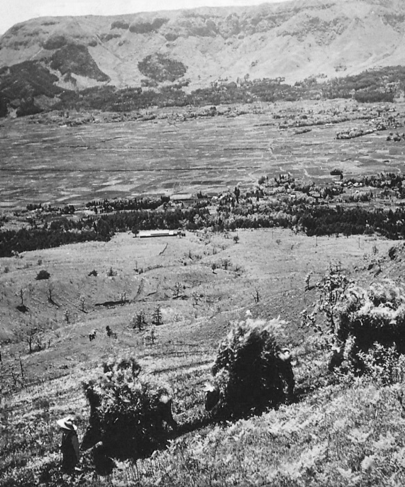 記録に残された阿蘇における草地利用の最も古い事例として、「阿蘇郡畜産組合三十年小史」は、「延喜式」(905)第二十八巻に肥後国の二重馬牧と波良馬牧が記録されていることを挙げています。この二重馬牧は阿蘇市二重峠付近と推定されますが、波良馬牧の場所については不明です。また、延暦・大同年間(782~810)に阿蘇味村が阿蘇牧監という牛馬飼育の責任者の地位にあったこと、内牧や外牧などの地名が存在することなどから、阿蘇における草原利用の歴史が長いことを述べています。