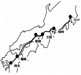 鶴崎港からは瀬戸内海航路~東海道~江戸となり、約1,025㎞です。