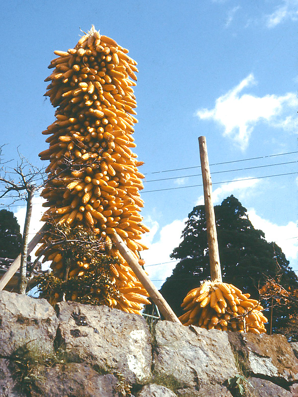 それまではヒエが多く栽培され、常用されていましたが、トウモロコシは生育旺盛で吸肥力が強いため、阿蘇のやせた畑地の粗放栽培には最も適した作物として定着し、食料、牛馬の飼料として、明治以降4,000~5,000㌶に栽培され、畑作の主産物となりました。昭和30年台後半から急激に減少し、近年青刈りの飼料栽培が多く、実取りのいわゆる阿蘇トウキビはわずかです。かつての品種は早生種の「早玉」、中生種の「中玉」、晩生種の「大デッチ」などで橙黄色、良質の硬粒種(フリントコーン)でした。近年多収性の一代雑種の品種も栽培され、焼きトウキビ用には粒が柔らかく甘い甘味種(スイートコーン)に代わりつつあります。