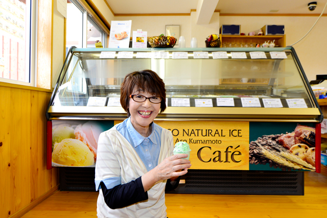 牛乳はもとより、加えるフルーツも野菜もすべて阿蘇のもの、つまり素姓のたしかなものしか使わない。焼き茄子アイスなどユニークな品も多い。むろん素材自身の香りを引き出す。