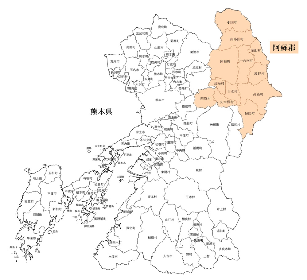 標高が高く、火口原地帯でも標高500㍍を越え、気候は準高冷地型を示して低温多雨。原野も広いので火口原では農業と畜産、外輪山外麓では酪農と林業が主産業となっています。古くは阿蘇国とよばれ、「和名抄」にも「阿曽」と注しており、波良、知保、衣尻、阿曽の4郷が見えます。阿蘇神社の神主の阿蘇氏は、噴火口の神健磐龍命と国造速瓶玉命の直裔と伝えており、阿蘇郡の郡司から阿蘇荘の荘官となりました。やがて阿蘇神社を中心とする武士団の棟梁として戦国時代まで勢力を振るっていましたが、島津氏の侵略に敗れ、以後は阿蘇神社を司祭する大宮司としての地位だけを保って、今日に及んでいます。加藤清正入国時の石高は40,804石8斗とされましたが、細川氏の台に54,628石と定められました。内牧には郡代が常駐し、坂梨、内牧、布田、高森、野尻、菅尾、北里、久住の八手永を支配していました。明治3年(1870)手永は郷となり、郡代役所も出張所から廨舎、支庁と改称され、12年には郡役所となりました。さらに19年、郡役所は宮地に移転し、大正15年(1926)まで続き廃止されました。現在の県事務所は昭和17年(1942)再設された地方事務所を継続したものです。軍の管下町村は、明治22年(1889)には1町25村であったが、昭和28年以降の町村合併で一の宮町、阿蘇町、南小国町、小国町、産山村、波野村、蘇陽町、高森町、白水村、久木野村、長陽村、西原村の6町6村となりました。昔阿蘇谷には豊後街道、南郷谷には南郷往還があり、豊後街道は江戸時代に参勤交代の通路として重視されてきました。今日では九州横断道路をはじめとして多くの観光道路が開発されました。