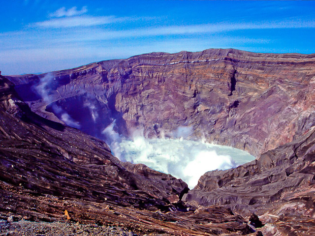 一般に阿蘇は単体の山ではなく中央火口丘群の根子岳・高岳・中岳・烏帽子岳・杵島岳等を総称したものです。中岳の火口は現在も時々噴火する活火山です。
