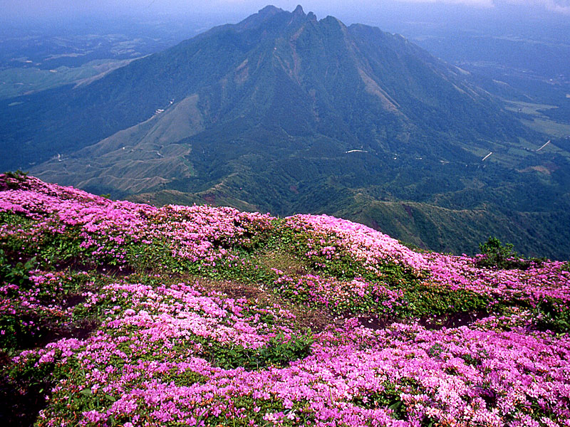 肥後国(ヒゴクニ)の語呂合わせで覚えられ、6月中旬には山頂付近での群生が咲き誇り、ピンクの絨毯が山肌を美しく彩ります。