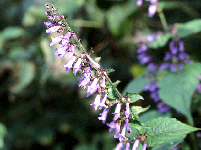 茎先と葉腋から円錐花序を形成し柄の先に青紫色をした唇形の花を横向きにつけます。