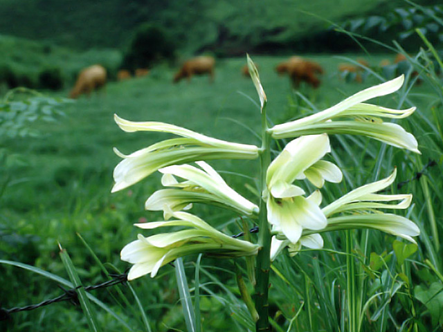 花は緑白色で10~15cmの漏斗状の花被片6枚がありの先端になるほど白くなります