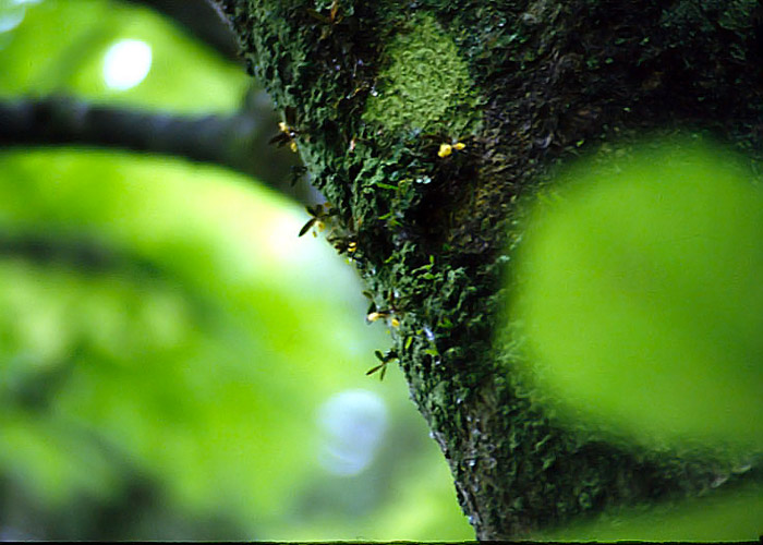 茎の中間から基部側にある葉の隙間から根をだし上向きに伸びながら樹皮に取り付きます。