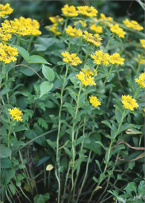 茎先に集散花序を出し、たくさんのの黄色い小さな花をつける。