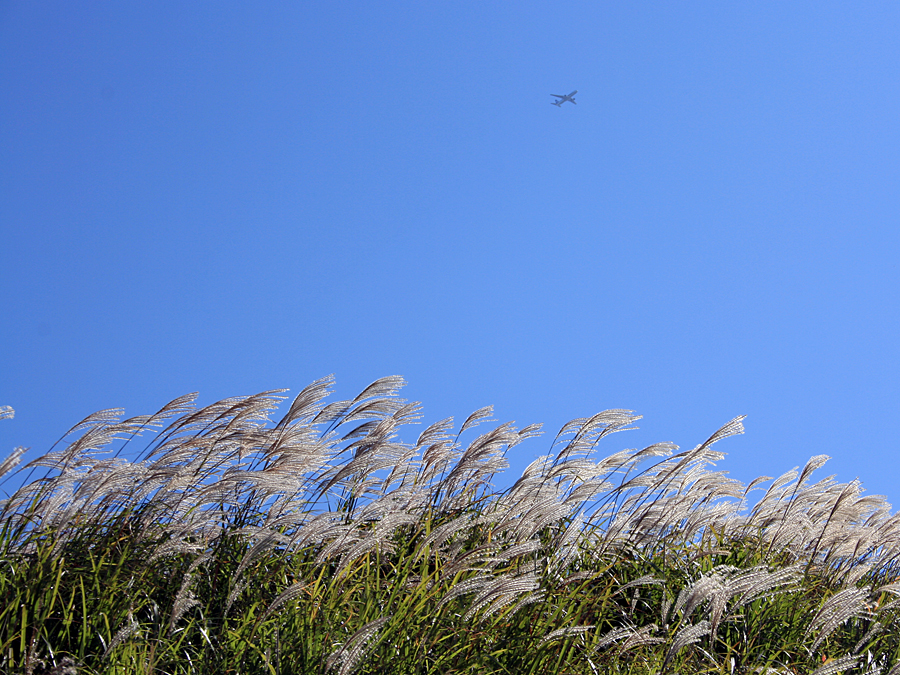 阿蘇の原野にはススキとネザサが主に自生しています。ススキはほかの植物を抑えて成長する力が強く、密集していて、初秋の阿蘇の草原の風景を一面銀色に染めて揺れます。