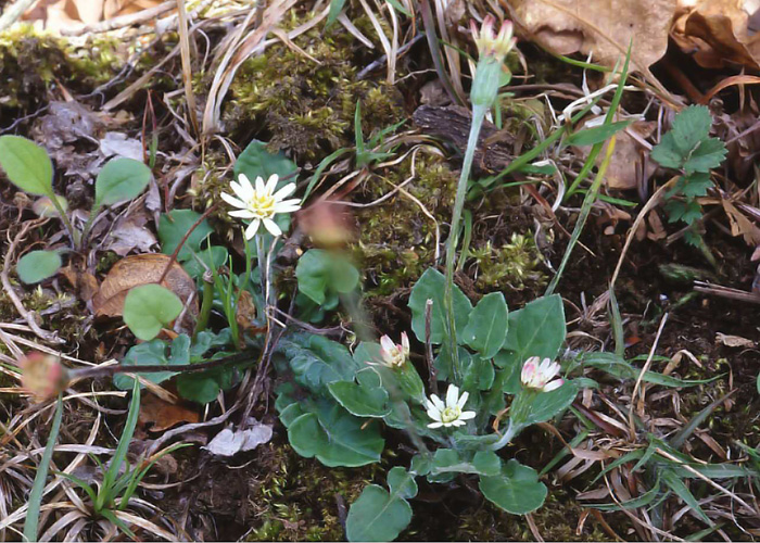 白色で裏面が紫色を帯びた径1.5cmの頭花をつけ、春型の頭花には、縁一列に舌状花がつきます。