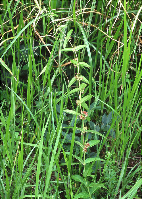葉は対生し、葉柄は短く2~5mm、葉身は長楕円状披針形でとがります。