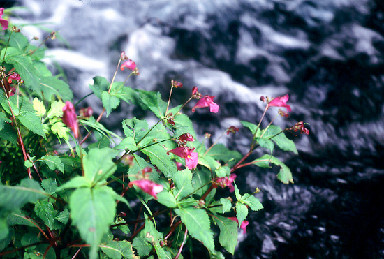 阿蘇のツリフネソウは地域ごとに色の違いがあり、赤や紫、桃色と似たものにハガクレツリフネもあります。