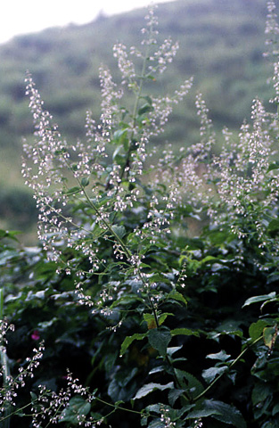 草丈は約100cmほどで、葉は対生し、広卵型で葉先は尖ります。