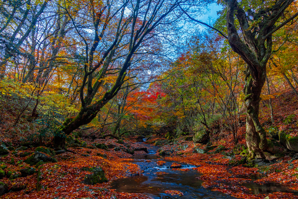大きな岩肌(いわはだ)を洗うように流れる清流と、川の両岸に生い茂る広葉樹(こうようじゅ)のコントラストは鮮やかです。