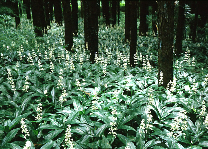 夏に茎の先端から穂を伸ばして白い一日花を咲かせます。
