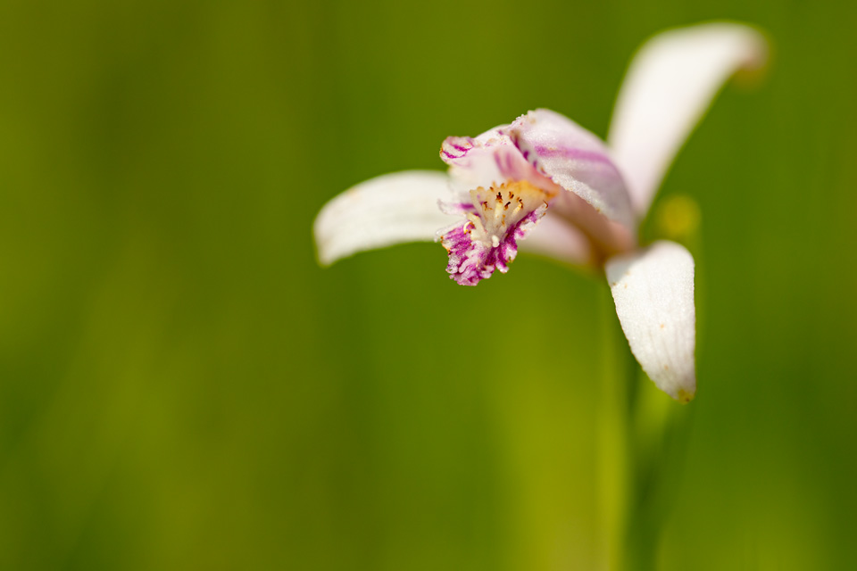 蕊柱は長さ5mm、葯は4角状球形で、白色。花がまったく白色のものもあるようです。