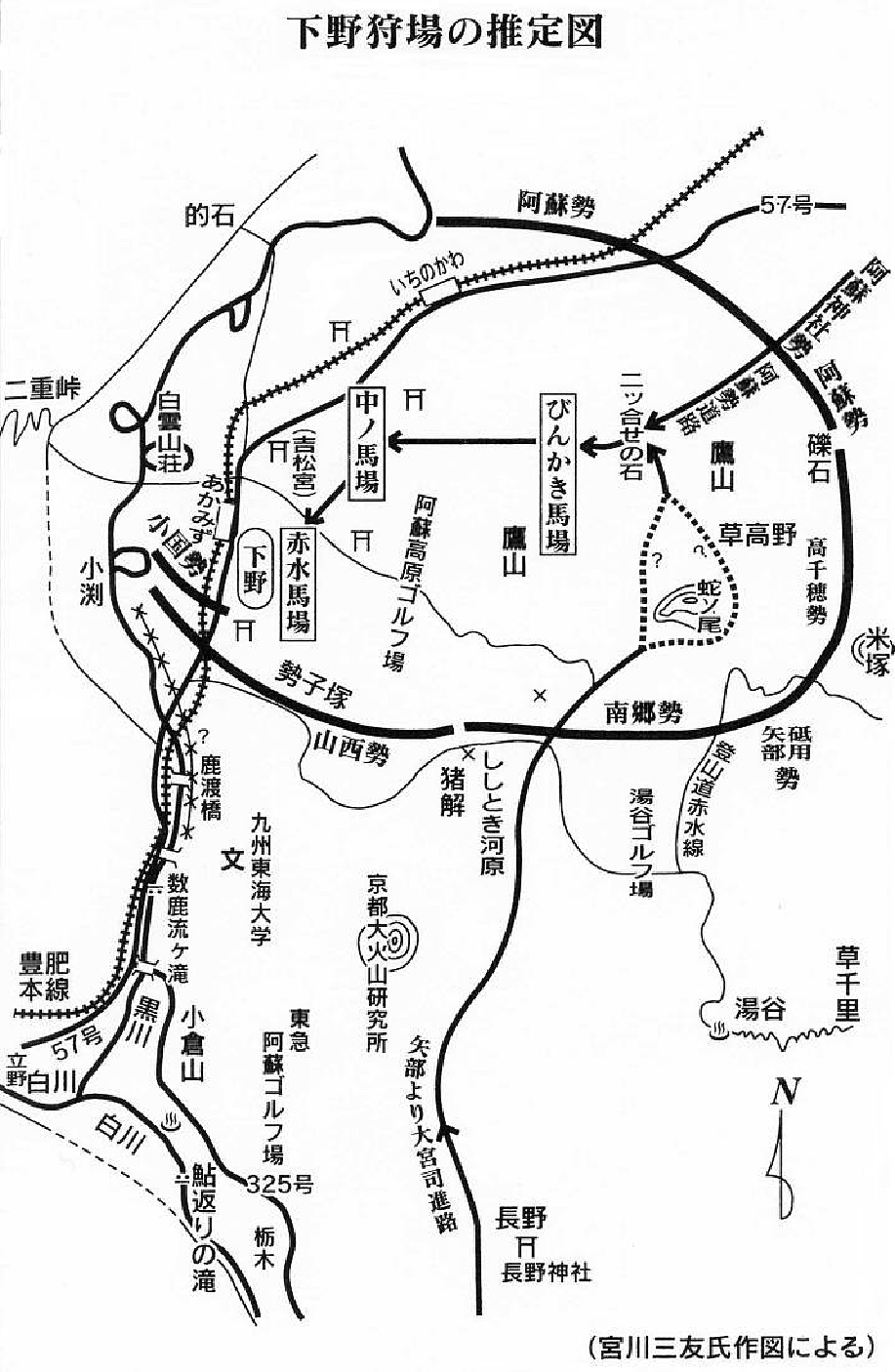 下野とは、現在の坊中(黒川)からの登山道、南阿蘇村下野からの登山道と北外輪山麓の黒川に囲まれた広大な原野沼沢(しょうたく)地です。狩場は永草の「鬚捊(びんかき)の馬場(ばば)」、「中の馬場」、「赤水の馬場」と3つに分かれています。