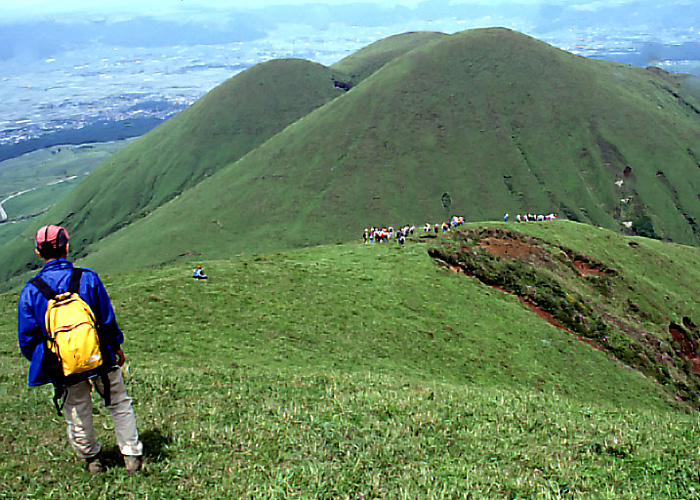 杵島岳・往生岳は、頭部侵食によって草原の山体斜面に出来た何本もの縦筋が見られます。現在、この浸食谷は山ができてから、まだあまり時間が経っていないため、この浸食谷は頂上まで達しておらず、幼年期の地形を示しています。浸食谷の幅は、数㍍~数十㍍くらいで厚い火山灰表土を削っているが、実際にこの谷に入ってみると意外と谷幅は広く、草やかん木が生い茂っています。