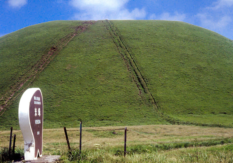 阿蘇登山の観光バスが杵島岳の下を通る時、ガイドが下に見える米塚を指して