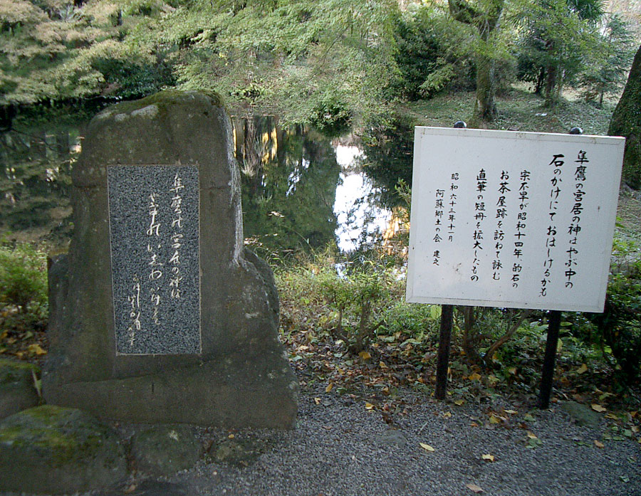 この歌碑の歌は、昭和17年5月、中風にかかった不自由な体で、内牧の達磨旅館に泊ったのち、鞍岳山中に消息を絶ったが、その折に「相対如夢寐」と共に書いたもので、不旱の59年の生涯の絶筆となったものです。