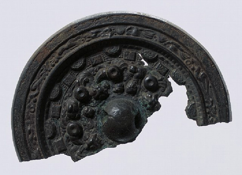 昭和48年の圃(ほ)場整備工事により、6号墳は破壊されてしまいましたが、画文帯環状乳神獣鏡(がもんたいかんじょうにゅうしんじゅうきょう)と鉄剣が出土しました。この鏡と同型(鋳(ちゅう)造型(ぞうかた)が同一)の鏡は、和水町の江田船山古墳(前方後円墳・国史跡:銀象嵌銘文大刀(ぎんぞうがんめいぶんたち)などの出土品は国宝)、宇城市の国越古墳(前方後円墳・県史跡)のほか、宮崎、福岡県、香川県の5例が知られています。このことから、阿蘇地域の支配者層が中央の大和政権との強