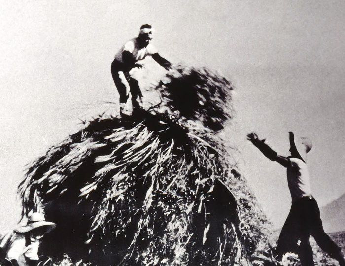 刈り取られた野草は1~2日天日乾燥された後、稲手(稲の茎)で結束され、草小積み(結束した草を、垂直に小高く積み上げたもの)に積み上げられます。