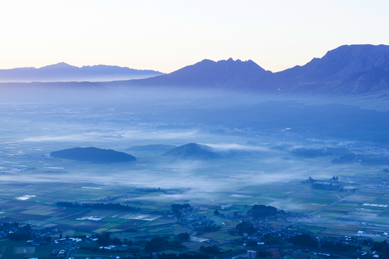 JR豊肥本線内牧駅の北東、阿蘇谷の平坦面(へいたんめん)から突出(とっしゅつ)する3つの小丘は、独立した1火山の名残です。