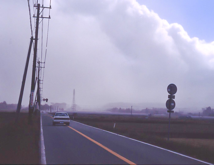 空中を浮遊(ふゆう)する火山灰によって視界が悪くなるだけでも交通事故が起きやすくなります。 しかも、道路が火山灰で覆われるという条件が加わって、 事故の危険性はさらに高くなります。 道路標示が見えなくなるだけでなく、火山灰が薄く積もった路面は、 湿っていても乾いていても非常に滑りやすく、ブレーキが利きにくくなります。 火山灰が厚く積もると、道路が通行不能になり、 被災地域への物資の供給が途絶えてしまうこともあります。