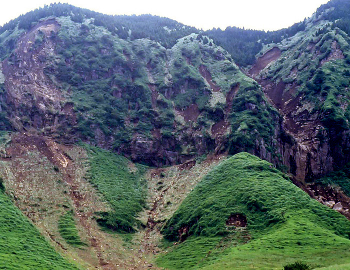 地震や噴火あるいは大雨などを引き金として、山体の一部が崩壊するような大規模な崩壊を山体崩壊と呼びます。