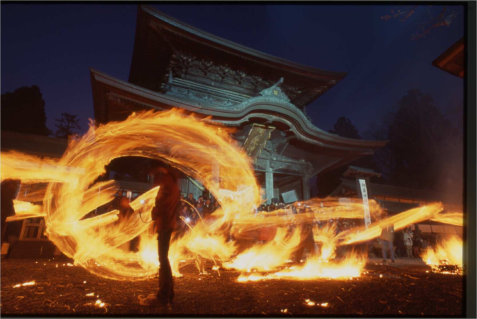 辺(あた)りがうす暗くなった宮地の町中では、人々が思い思いに手にしたカヤを束(たば)ねた松明(たいまつ)に火をつけて、一行の到着を今か今かと待ち受けています。松明が打ち振られ、阿蘇神社の楼門(ろうもん)が闇(やみ)の中におごそかに浮かび上がると、やがて花嫁行列がしずしずと松明の光の輪の間を抜けて行きます。
