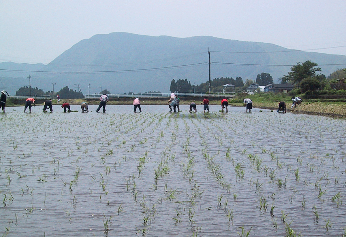 阿蘇地方には、田植えの時、「のろ打ち」という習慣(しゅうかん)がありました。農業の神様である健磐龍命(たけいわたつのみこと)は、阿蘇地方の百姓たちに米作りを教えました。命は、田植えの時期には、他の神様と一緒になって田植えをされ、身分を問わず協力し合うことを教えました。それがいつの間にか、根強く阿蘇地方に残りました。