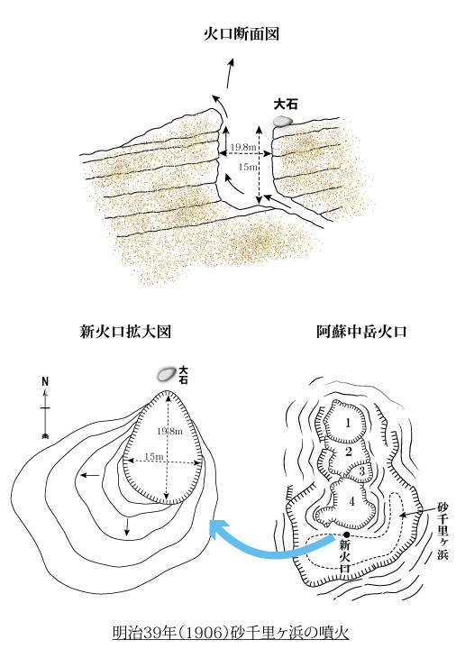 火口は初めに九尺(約2.7m)四方程度でしたが、その後、噴煙活動が活発になり、約一年後の明治40年(1907)7月には東西四間(約7.2m)南北八間(約14.4m)、深さ八間(約14.4m)余りの大きさになりました。