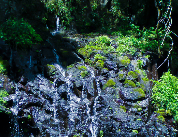 すり鉢状の地形をしており、岩場を下ると四方から小さな滝となって清水が流れ落ちています。