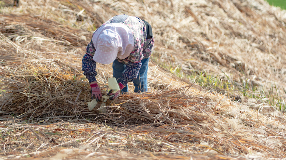 茅切りは、茅の葉が落ちて茎だけになる2月から3月にかけて行なわれます。茎だけで葺いた茅屋根は、見栄えがよく、長持ちします。しかし、昭和30年代までにほとんど瓦屋根に移行してしまいました。伝統ある茅屋根を波野ではまだ見かけることもありますが、阿蘇市内では完全なものはほとんど残されていません。
