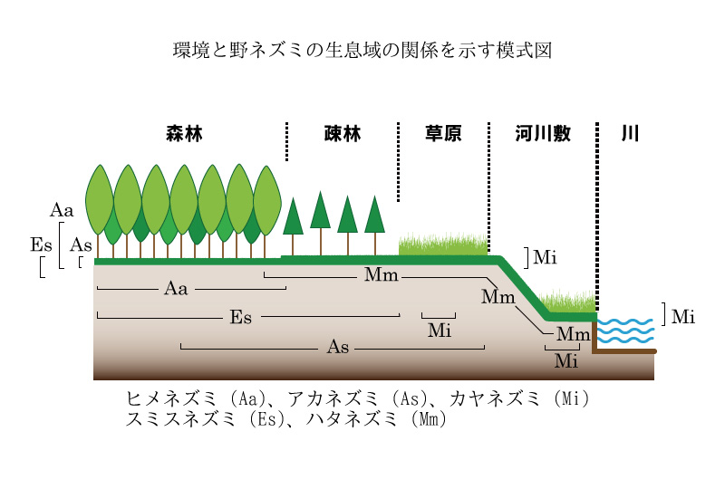 世界的にみた場合、ネズミの生息域は熱帯から寒帯、低地から高地、密林から砂漠にかけてなど、海を除く世界の様々な環境に広がっています。基本的には、地表面を中心とした生活をしていますが、中にはヨーロッパや北アメリカに生息するミズハタネズミの仲間のように、かなり水の生活に適応したものもいます。阿蘇のネズミたちも、その生息環境を細かく調べていくと、種によって少しずつ異なっています。